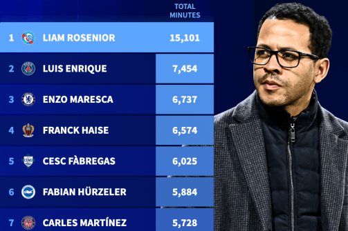 如图所示,在为年轻球员提供发展机会这方面,罗西尼奥确实是属于顶尖人物。